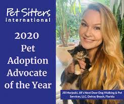 The Pet Adoption Advocate Award through Pet Sitters International recognizes Jill Merjeski, in Delray Beach, Florida, for her efforts to help feral cats and promote South Florida pet adoptions and online pet advocacy.
